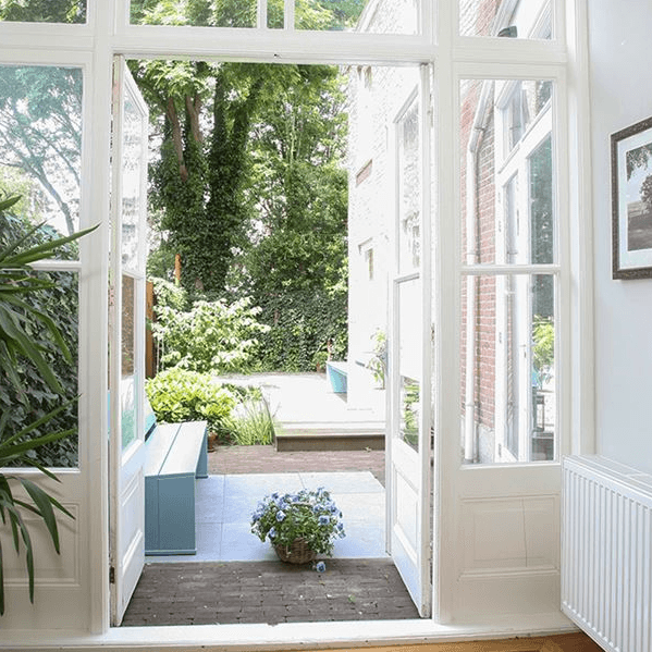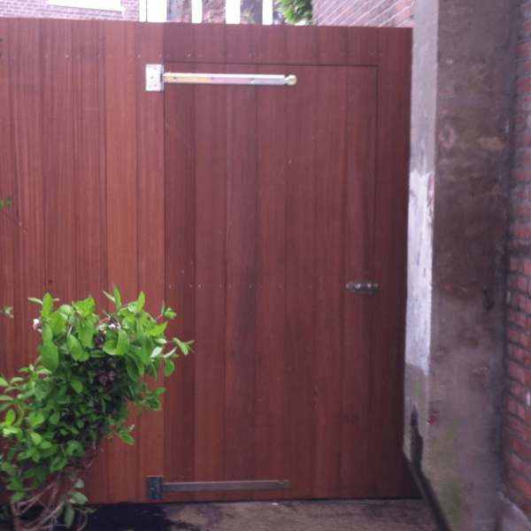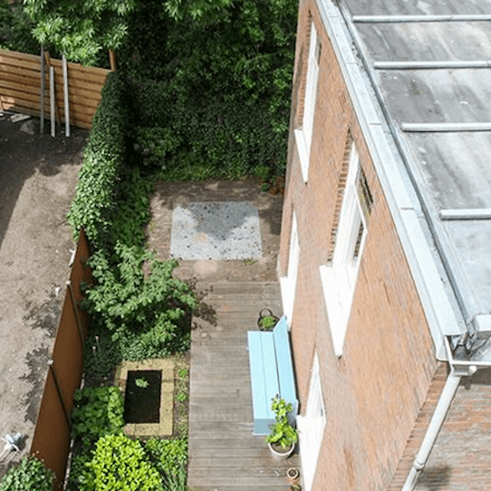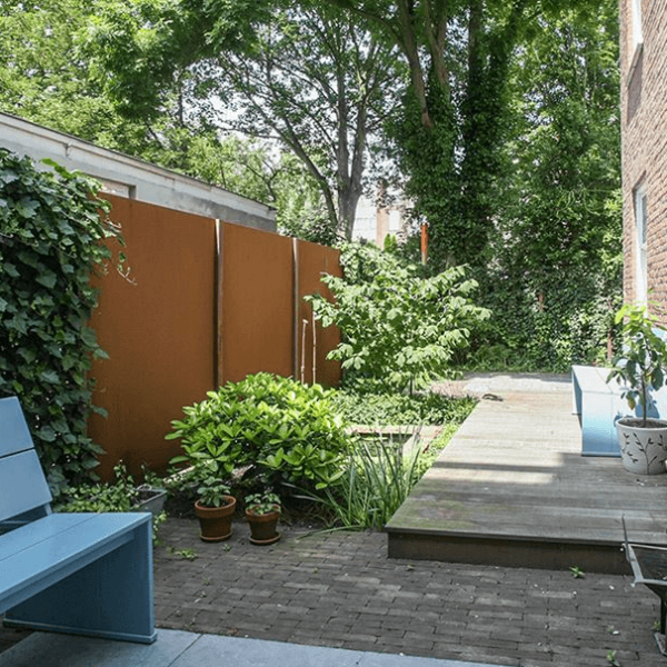 Deze woning heeft achter een uitbouw. Daardoor is de tuin en echte pijpenla. Door de tuin op te splitsen in 3 gedeeltes, waarvan de middelste iets verhoogd, krijg je diepte en spanning in deze tuin. Cor-ten-stalen platen, die ’s avonds zijn verlicht, accentueren het middelste deel. Als blikvanger een simpele rechthoekige vijver.