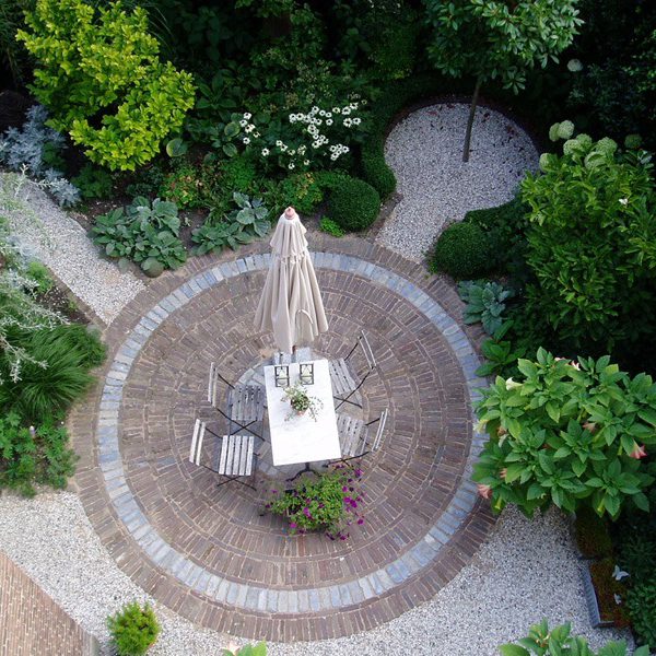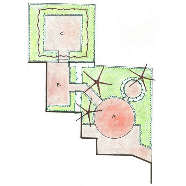 This garden of a Victorian house, built in 1903, is very traditional. The space is divided into three “garden rooms”: The living garden (A on the plan), The kitchen garden (B) and  the sunken garden with trampoline (C). The rooms are separated by medium-sized Yew hedges. Buxus formed into large balls accentuate the layout. Pleached trees provide a natural screen for privacy.