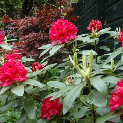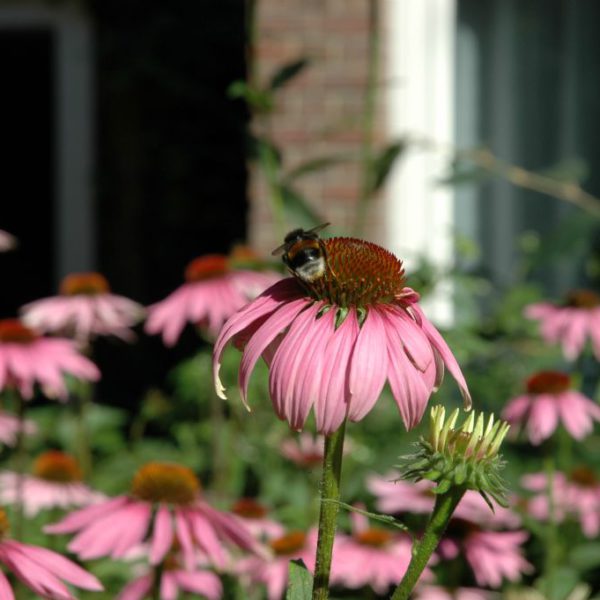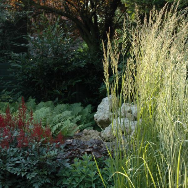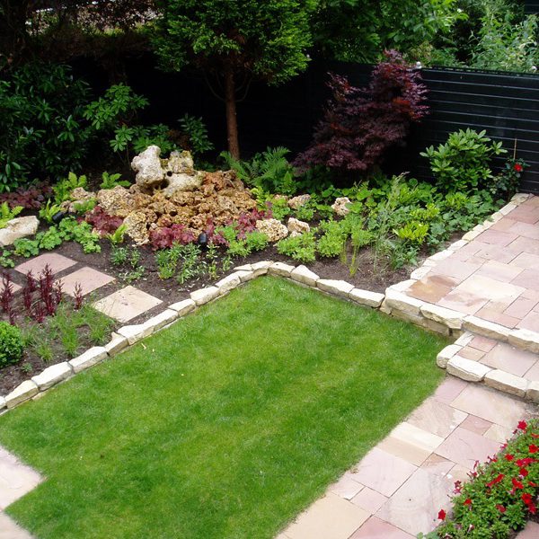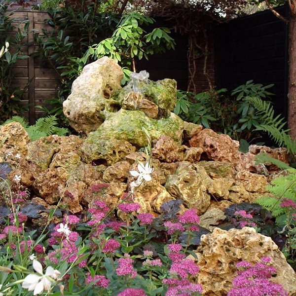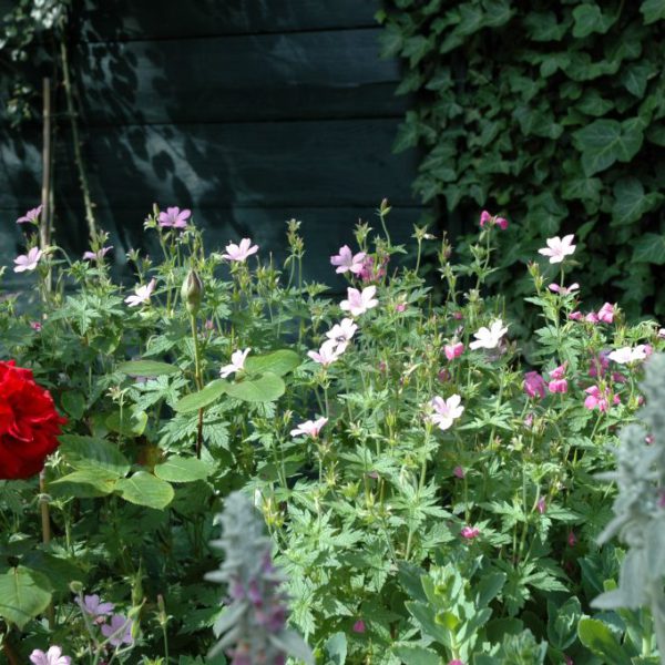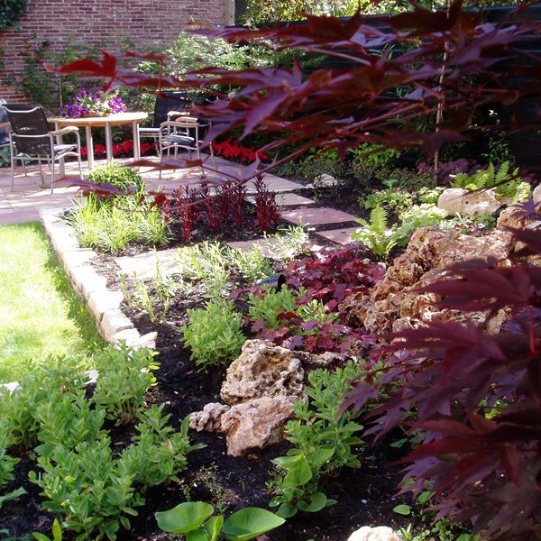 De kleurencombinatie van de beplanting is lila-paars, roze en wit met een felrood accent. Hiermee wordt de hoofdkleur van de moderne inrichting van de woning in de tuin voortgezet. In de hoek van de tuin is een waterloop (C), bestaande uit een eenvoudige stapeling van ‘Maanstenen’. Het geluid van voorbijkomend verkeer valt weg door het zachte geklater van de fontein. Deze waterloop is ook te zien vanuit de eetkamer en de keuken. ’s Avonds is het sfeervol verlicht.
