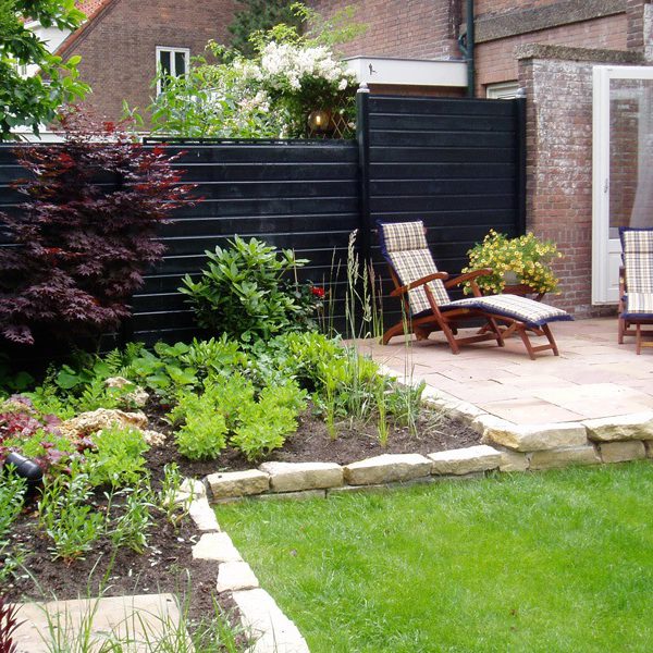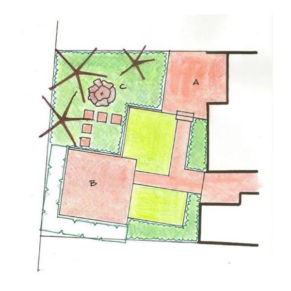 Dit huis heeft die typische dertiger-jaren bouw uit de vorige eeuw. De tuin heeft een voor -, zij- en achter-gedeelte. De schuine lijnen van de woning zijn in de tuin doorgezet. Hierdoor krijgt de afgesloten achtertuin een ‘opener’ karakter. Er is een ochtend- (A) en een avondterras (B), zodat men altijd kan kiezen voor het zitten in de zon of schaduw. Als bestrating is gekozen voor een mooie warme natuursteen, gelegd in ‘wildverband’.